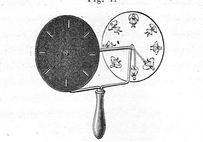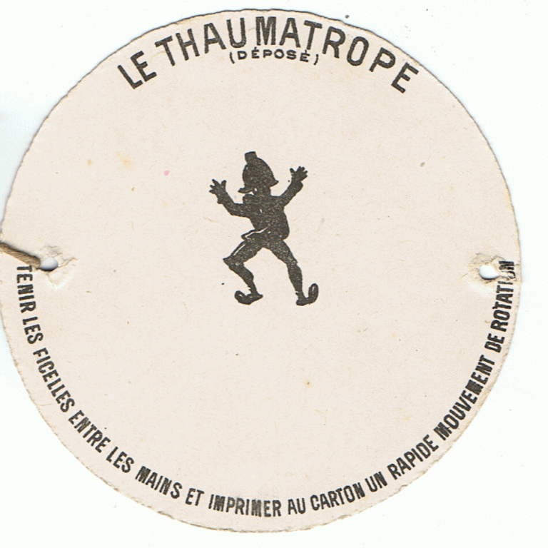 1826 : jouet optique, le Thaumatrope (invention du Docteur Fitton). Chaque face d’un disque dispose d’un dessin : en faisant tourner rapidement ce disque, les deux images se superposent.