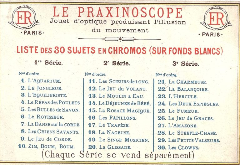 Les séries de sujets disponibles pour le Praxinoscope.