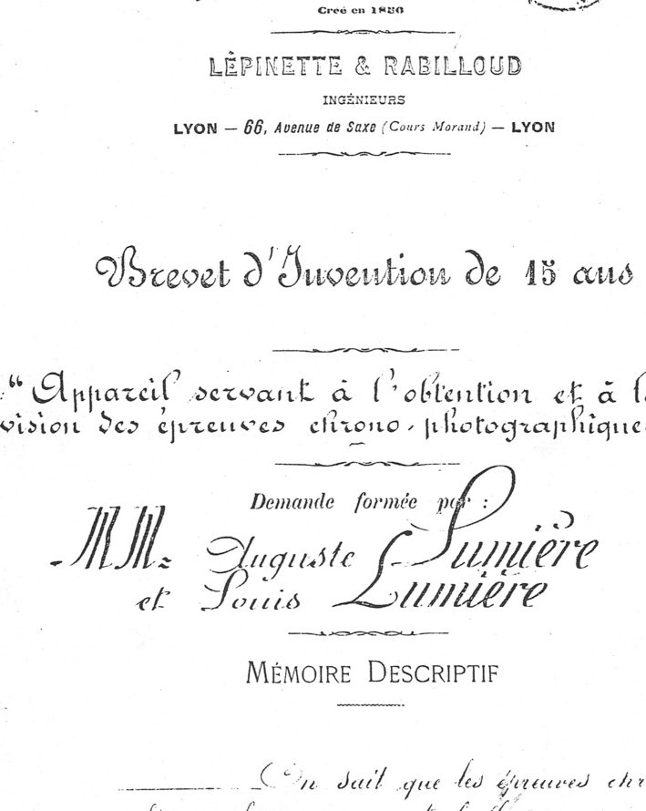 1895, 13 février : dépôt d’un brevet par les Lumière d’un “Appareil servant à l'obtention et à la vision des épreuves chronophotographiques”. L’appareil reprend le film d’Edison et le défilement intermittent de Marey pour la prise de vues. L’originalité de l’appareil Lumière résidait dans l’excentrique inspiré du pied de biche de la machine à coudre et la possibilité de projeter les images sur un grand écran. L’appareil était mixte : prise de vues, tirage et projection. Des brevets additionnels viendront apporter les perfectionnements nécessaires (30 mars 1895, 6 mai 1895 et 28 mars 1896).