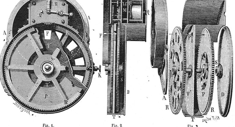 1894 (juillet): Demenÿ trouve une solution pour le déplacement de la pellicule en plaçant un excentrique (came battante) avant l’enroulement de celle-ci sur la bobine réceptrice. Toutefois, le dispositif butait toujours sur l’absence de perforations pour séparer de manière régulière les images. Ce n’était pas le souci premier de Demenÿ car, pour lui, la prise de vues devait servir à alimenter son Phonoscope.