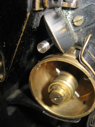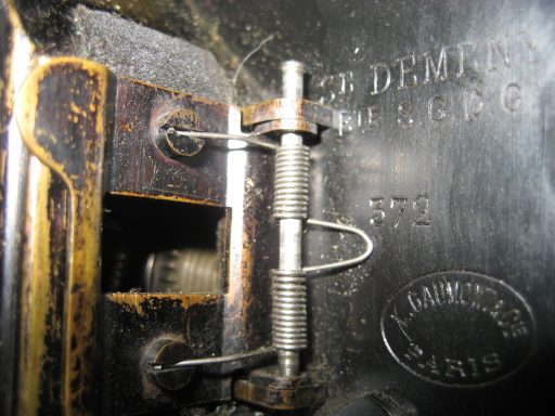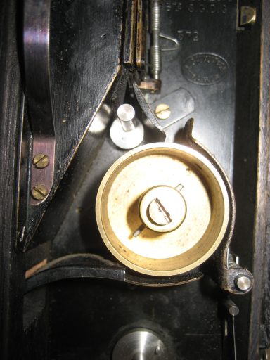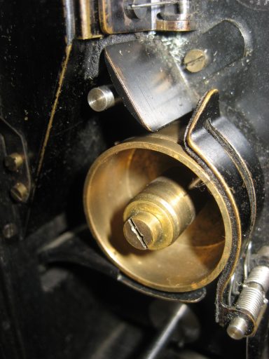 Astucieusement, le boitier contenant le film proprement dit était “autonome” par rapport au mécanisme. En effet, on pouvait actionner à la main l’avancement du film comme cela se faisait à l’époque. En couplant ce boitier avec celui du mécanisme à ressort, l’opérateur avait à sa disposition une caméra à moteur. La manivelle pouvait à la fois remonter le ressort du mécanisme et faire tourner l’appareil sans son moteur !