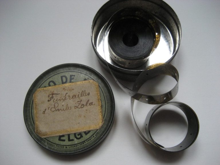 Le film de 15 mm à perforations centrales et sa boite métallique... et probablement l'un des premiers reportages tournés par un amateur (compte tenu du format) (photo : ©JFPB).