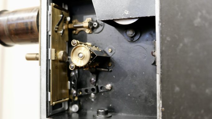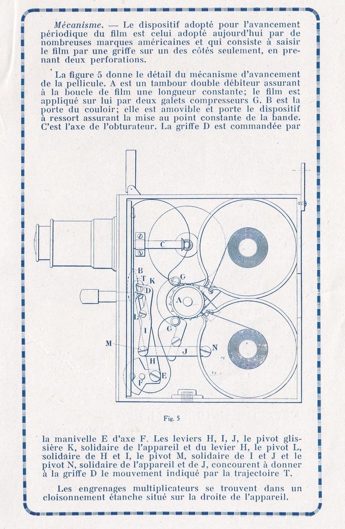 La pellicule est mue par une griffe à double dent (deux perforations en prise) positionnée sur un côté (il n’y a pas de contre-griffes). Un tambour unique assure des boucles débitrice et réceptrice constantes à la pellicule. Le maintien du film est assuré par un couloir presseur dont la partie supérieure est amovible grâce à un dispositif à ressort. La visée se fait par le dessus par une lunette de type “Galilée” et qui se replie. L’autre partie de la visée, une pièce métallique en forme d’œilleton, étant dépendante du magasin de film. La mise au point se fait par un verre dépoli. L’appareil comporte un compteur de mètres et d’images. Un perforateur permet de marquer la pellicule (une facilité pour le repérage au toucher en chambre noire par exemple).