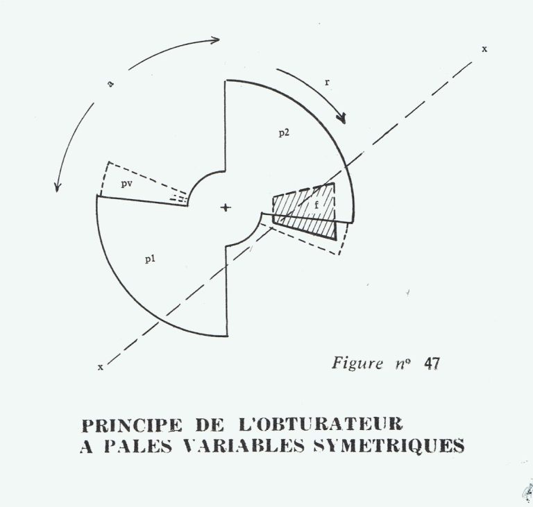 Il existe aussi un type d’obturateur composé de 2 parties pleines et 2 parties évidées : c’est l’obturateur symétrique (sur lequel on peut adjoindre des pales mobiles le transformant ainsi en obturateur variable…). 1 tour d’obturateur symétrique impressionne 2 images et pour une même exposition d’image, l’ouverture angulaire est réduite de moitié (90°).