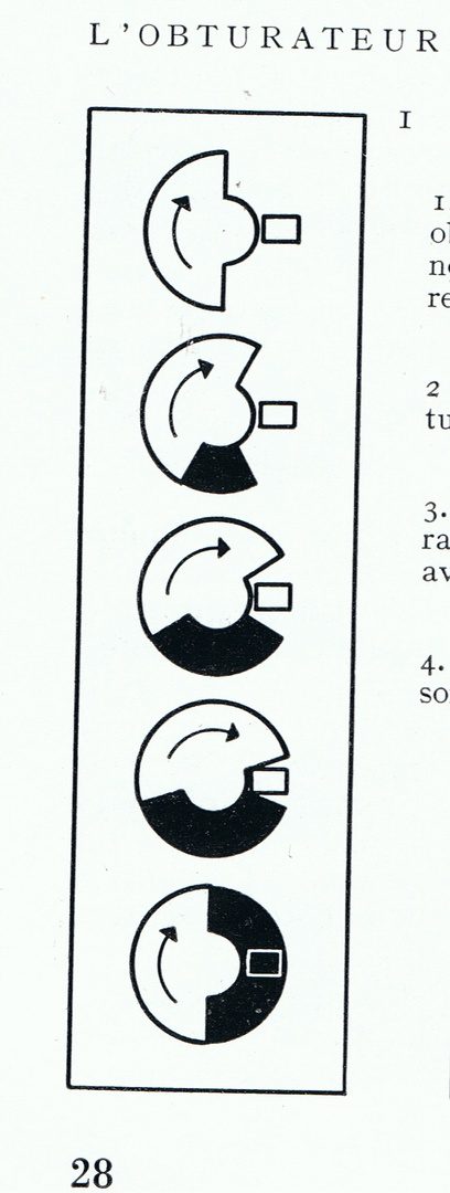 L’obturateur est un disque circulaire plan constitué d’une pale opaque de 180° qui obstrue la fenêtre d’exposition au moment du déplacement de la pellicule ; l’autre partie qui laisse passer la lumière pour impressionner une image, est donc égale. Le calcul du temps d’exposition (T) est donné par la formule : T=a/v où “a” est l’angle d’obturation et “v” la vitesse angulaire en ° (360* x images impressionnées à la seconde). Si l’on juxtapose sur le disque initial un deuxième disque parfaitement identique qui puisse tourner autour du même axe, il sera possible de modifier l’ouverture de 180°, jusqu’à, éventuellement, fermeture complète du disque : c’est l’obturateur à pale variable.