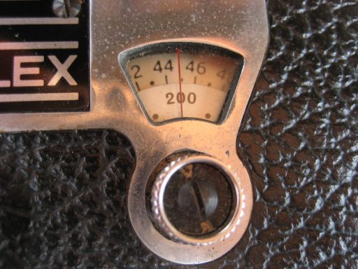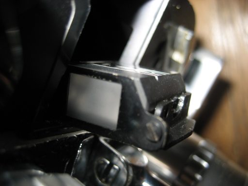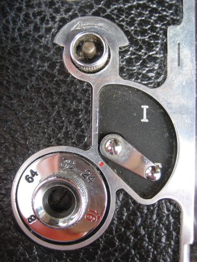 De gauche à droite : 1 - le compteur d'images. 2 - le bloc prisme avec son dépoli en partie supérieure. 3 - de haut en bas : l'axe pour la manivelle ; le bouton pour la prise de vues image par image (position "I") et en pose (position "T") ; le bouton pour régler les vitesses, et en haut à droite le trait vertical du repère "plan film" (photos : ©JFPB).