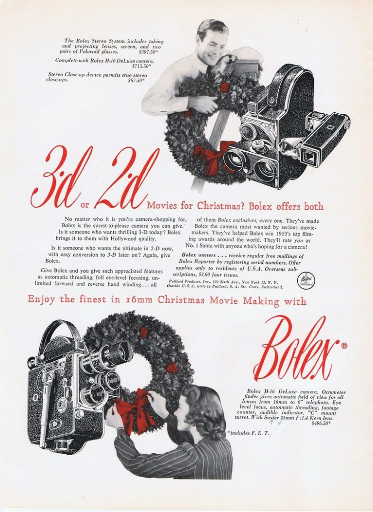 La page 2 du numéro de Noël 1953 de la revue Bolex Reporter, et le système optique Yvar monté sur la Bolex H16 (photos : ©JFPB).