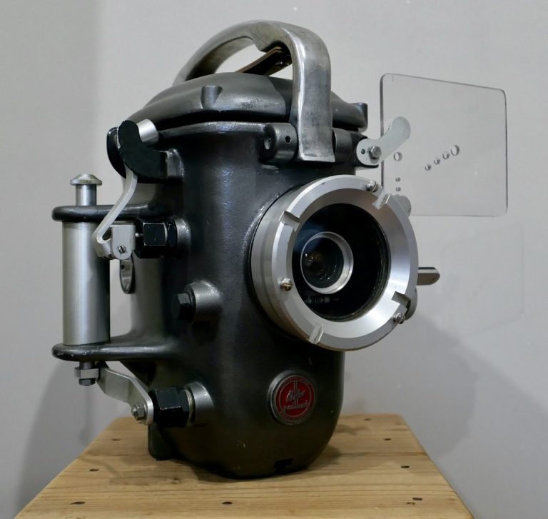 Le caisson pour prise de vues sous-marine étanche jusqu'à 100m. ! Le plongeur-cameraman dispose de trois commandes déportées : remonter le moteur, régler le diaphragme et déclencher le moteur. Ce caisson existait aussi en peinture orange (photo : ©JFPB).